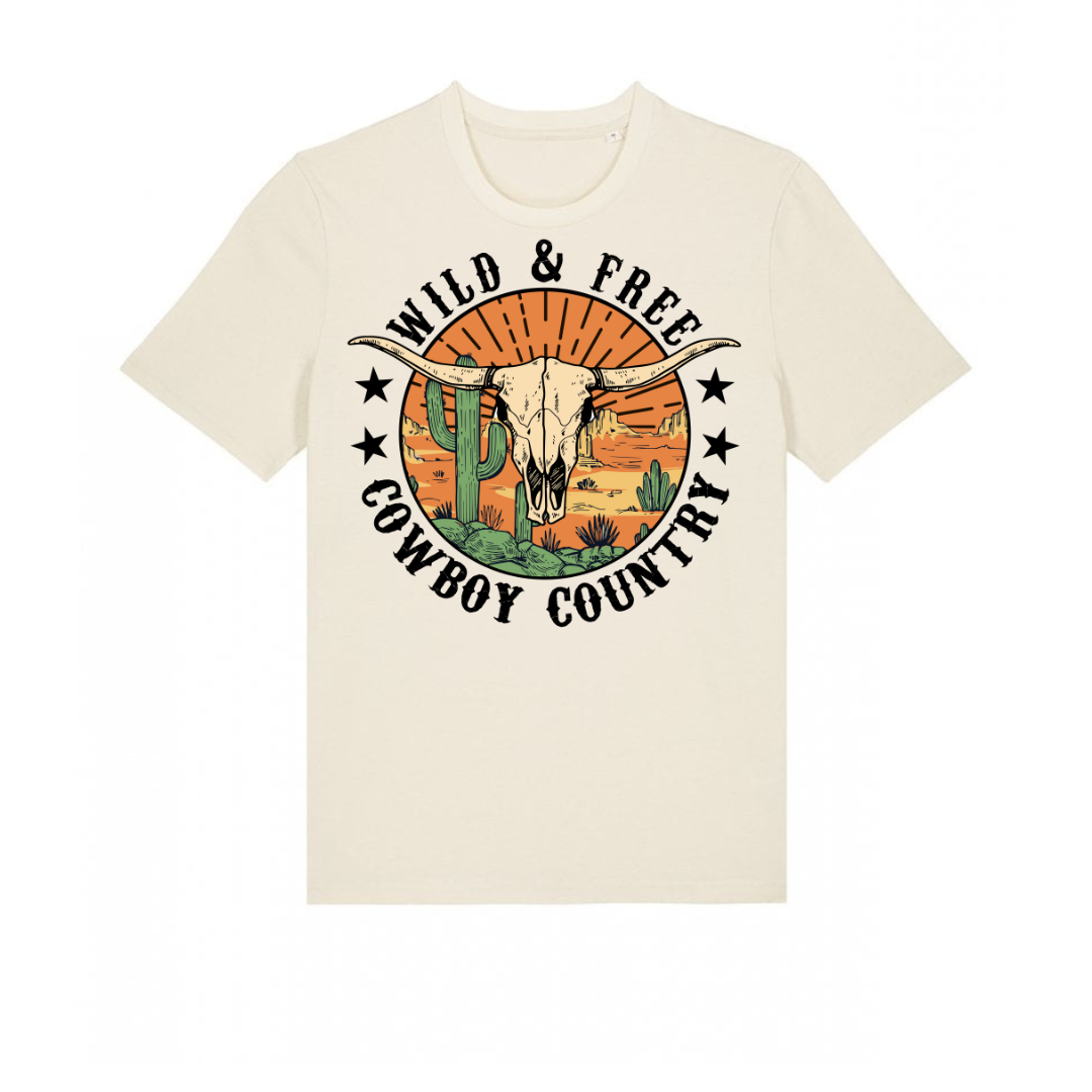 Tap into your untamed side with the Wild & Free Cowboy Country tee. A desert-inspired graphic featuring a longhorn skull set against a sunset backdrop of cacti and canyon hues. Whether you’re a country girl at heart or just love a bold western statement, this tee brings laid-back cowgirl energy to any outfit.