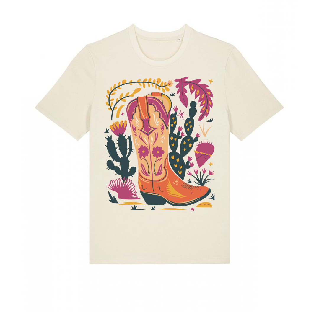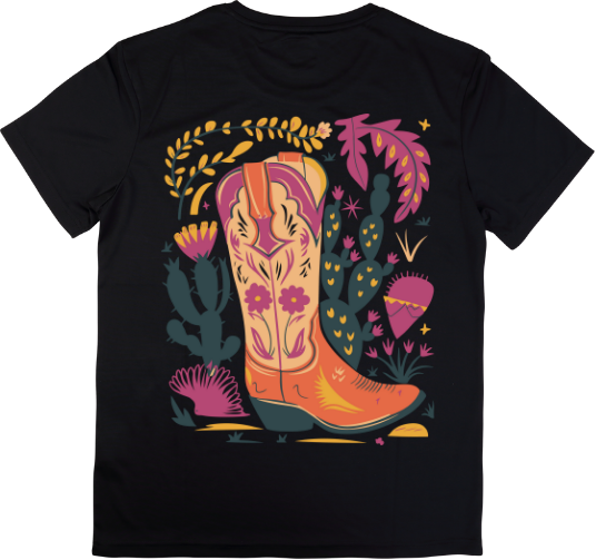 Step into bold with the Desert Bloom Boot tee. A vibrant celebration of cowgirl spirit and boho flair.