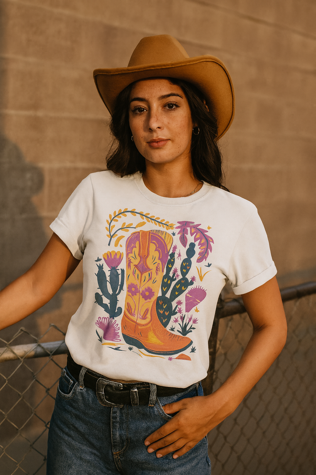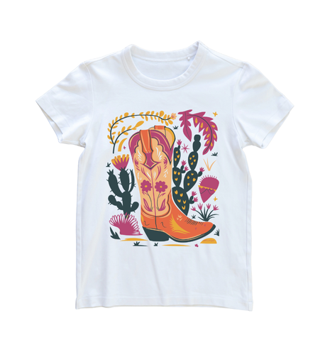 Featuring a retro western boot surrounded by desert florals, cacti, and pops of pink, gold, and turquoise, this graphic tee adds an artsy twist to your western wardrobe.