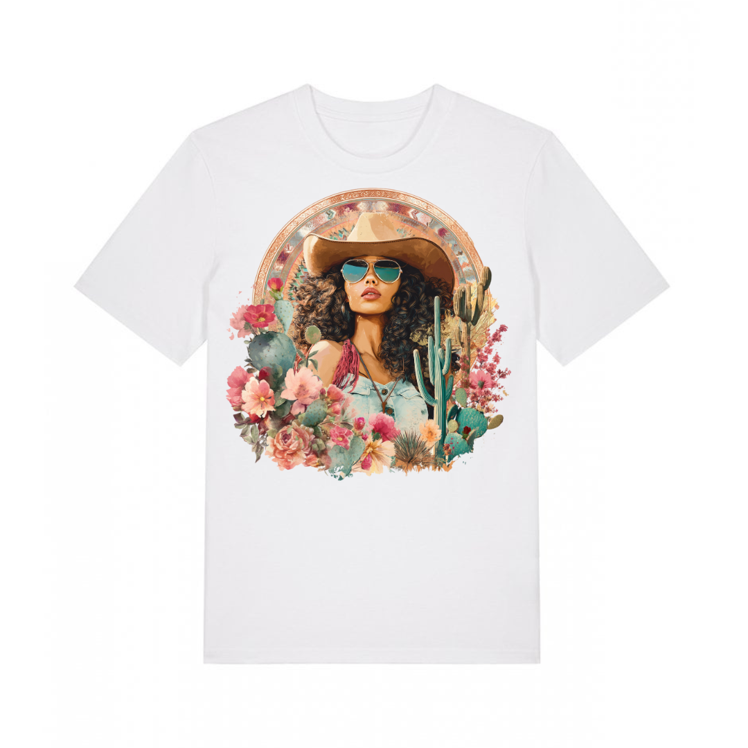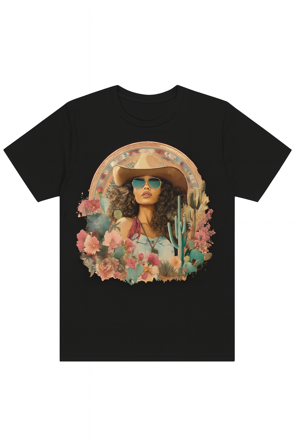 Add a little wild to your wardrobe with our Desert Cowgirl T-shirt. Where bold meets beautiful. This black tee features a striking print of a modern cowgirl, complete with sunnies, soft curls, and surrounded by blooming cacti and florals. The vintage-style artwork brings serious Western charm, while the soft cotton fabric makes it perfect for everyday wear.